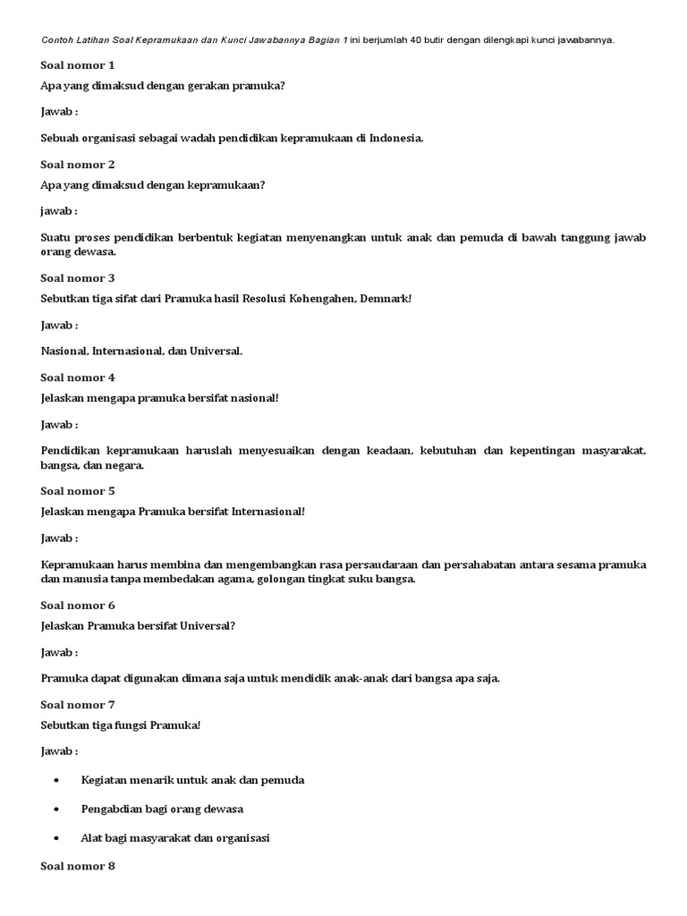 25 soal pengetahuan kepramukaan beserta kunci jawaban part 1 docx. Contoh soal pramuka pilihan ganda beserta jawabannya contoh soal terbaru. Menghadirkan data tanpa diminta e. Peristiwa apakah yang menjiwai majunya gerakan pramuka. Semoga sedikit soal yang bisa kakak berikan diatas bisa berguna buat sobar pramuka semuanya. Contoh soal kepemimpinan pramuka penegak. Soal pramuka penegak pilihan ganda dan. Soal pengetahuan kepramukaan 1 1. Contoh soal pilihan ganda pengetahuan pramuka. Masa menyiagakan masyarakat dalam menghadapi pemerintah kolonial belanda dalam merintis kemerdekaan yang ditandai dengan kebangkitan nasional 20 mei 1908. Teks recount beserta soal jawaban biography. Kumpulan soal pramuka beserta jawabannya bagian 1 dan 2. 35 contoh soal pilihan ganda jawaban untuk pramuka penggalang kelas sd dan smp terbaru 2021.