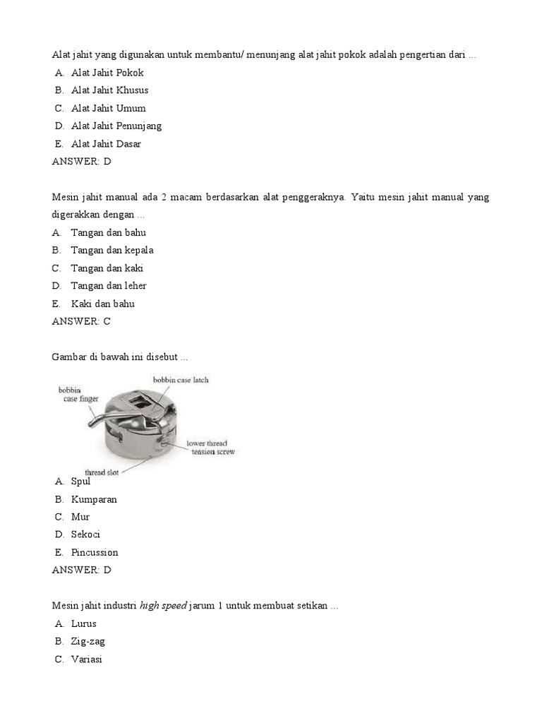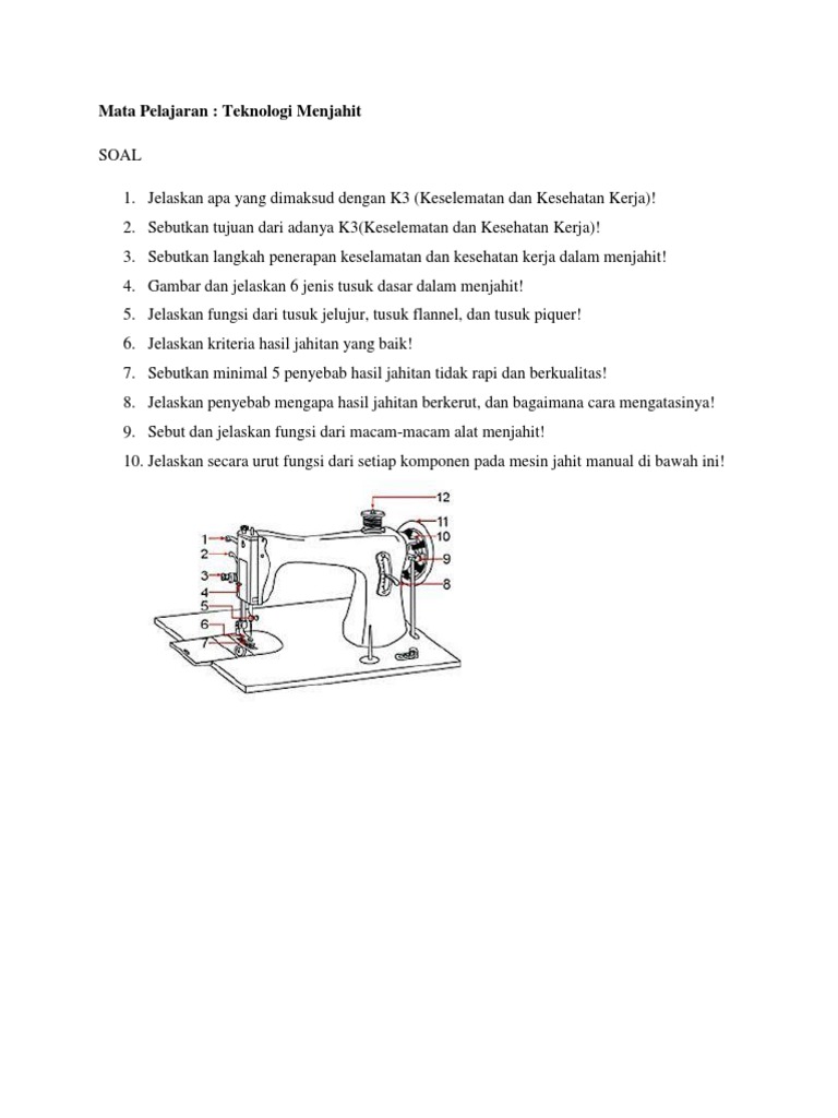 Soal pts 2 kelas 6 disukai diunduh dilihat. Mesin jahit manual ada 2 macam yaitu mesin jahit manual yang digerakkan dengan. Pemerintah kabupaten karanganyar dinas pendidikan dan kebudayaan sma negeri kerjo ulangan umum kenaikan kelas tahun pelajaran 2008 / 2009 mata pelajaran : 2 teknologi menjahit k3lh merupakan program kesehatan, keselamatan kerja, dan lingkungan hidup suatu instansi atau perusahaan yang memiliki banyak kesehatan kerja atau karyawan. Lainnya… ulangan teknik menjahit kelas x tata busana agustus 14, 2019 pengenalan alat jahit pokok dan alat jahit bantu kerjakanlah soal di bawah ini dengan benar.