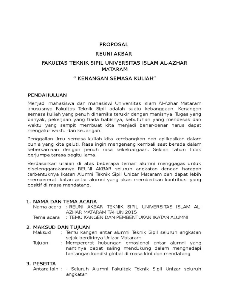 Kepada yth, para donatur dan sponsorship. Santai ini ada sekitar 100 orang yang menyempatkan diri bangun pagi dan bergegas menuju tempat ini untuk mengikuti acara reuni dan halal bihalal ini. proposal kegiatan reuni smp reuni smp negeri 1 karangmoncol. The emphasis is merely on the words extracting and constructing. proposal atau dalam bahasa inggrisnya disebut propose yang berarti pengajuan, merupakan salah satu alat yang digunakan untuk memperkenalkan suatu konsep, rencana atau blueprint dari suatu proyek kepada yang berwenang dalam tujuan untuk mendapatkan persetujuan atau kepentingan lainnya, mulai dari dana atau bantuan.